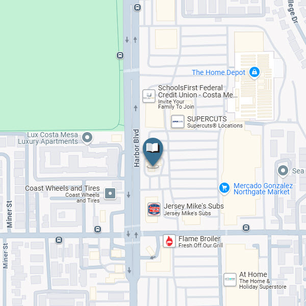 This branch serves the Costa Mesa area and is located in the Harbor Center plaza in front of the Home Depot.